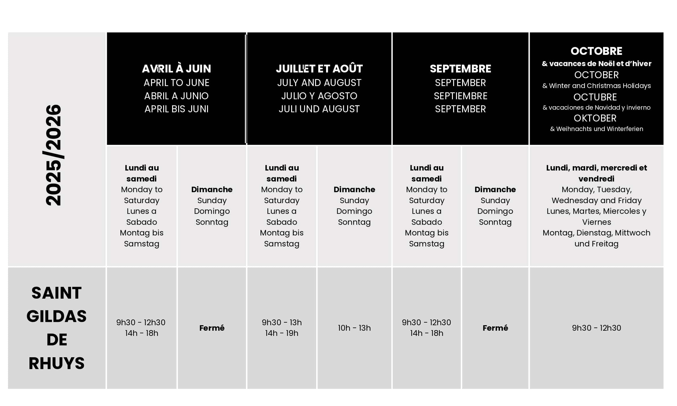 BIT de Saint-Gildas de Rhuys Partager sur Facebook Partager sur Twitter Accueil » Préparer » Infos pratiques » Office de Tourisme » BIT de Saint-Gildas de Rhuys Les horaires d’ouverture du bureau de Saint-Gildas de Rhuys HORAIRES D’OUVERTURE EXCEPTIONNELS Bureau fermé les 25 décembre et 1er janvier. Poursuivez votre visite Saint-Gildas-de-Rhuys, l’artistique ! St Gildas de Rhuys La collection d'éditions 2025 Contact