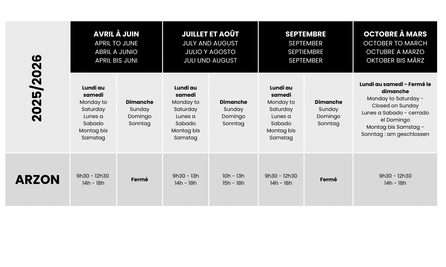 BIT d’Arzon Partager sur Facebook Partager sur Twitter Accueil » Préparer » Infos pratiques » Office de Tourisme » BIT d’Arzon Les horaires d’ouverture du bureau d’Arzon HORAIRES D’OUVERTURE EXCEPTIONNELS Bureau fermé les 25 décembre et 1er janvier. Le bureau sera exceptionnellement fermé jeudi 18 décembre, de 14h à 18h. Le bureau fermera exceptionnellement à 12h30 le 24 décembre. Le bureau fermera exceptionnellement à 16h le 31 décembre. Poursuivez votre visite Arzon Arzon La collection d'éditions 2025 Contact