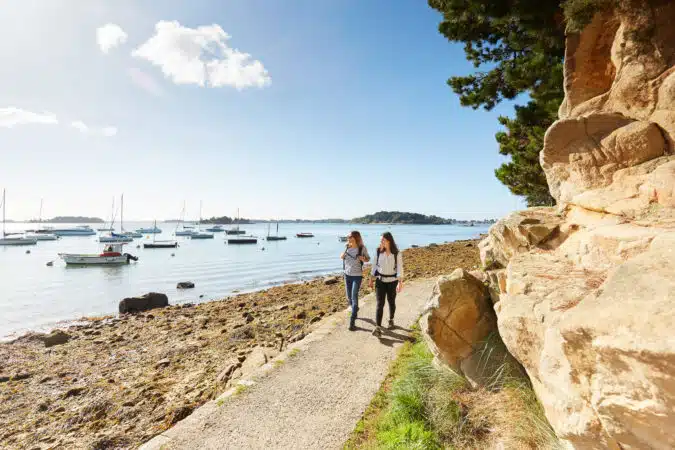 La presqu’île de Rhuys, située au sud de Vannes, offre un mélange fascinant de paysages côtiers et de patrimoine historique. Elle est connue pour ses plages de sable fin, particulièrement appréciées sur la côte atlantique, ainsi que pour ses sites naturels tels que les marais de Suscinio où l’on peut observer de nombreuses espèces d’oiseaux. Les visiteurs peuvent explorer des sites historiques comme le château médiéval de Suscinio et l’abbaye de Saint-Gildas de Rhuys. La région est également idéale pour les activités nautiques et les randonnées, notamment sur le sentier côtier GR34 qui offre des vues imprenables sur le Golfe du Morbihan