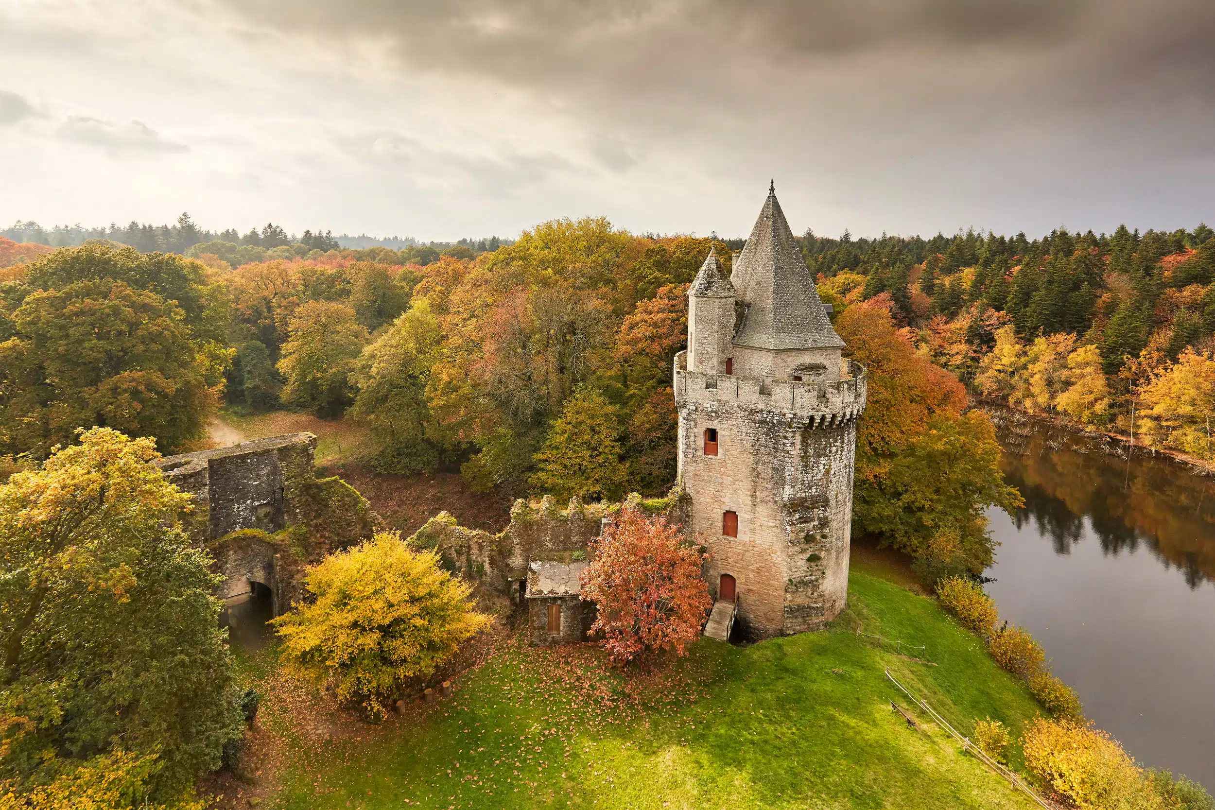 La Forteresse de Largoët Partager sur Facebook Partager sur Twitter Accueil » Explorer » Vivre l’exceptionnel… » Visites » Les châteaux du Golfe du Morbihan » La Forteresse de Largoët Au cœur d’un site enchanteur niché entre un paisible étang et un sous-bois s’élève un impressionnant donjon. Explorez la résidence des seigneurs de Largoët et percez les énigmes d’un surprenant landscape game. Tour de Largoët – Elven Tour de Largoët – Elven Tour de Largoët – Elven Tour de Largoët – Elven Tour de Largoët – Elven Les tours d’Elven Situées à 15 minutes de Vannes dans les Landes de Lanvaux, les tours d’Elven demeurent les vestiges d’un château fort construit entre les 13e et 15e siècles. Cette forteresse médiévale bordée d’un étang et d’une forêt était la résidence des Seigneurs de Largoët. Le site conserve trois principaux édifices reliés par des courtines : le châtelet d’entrée, le donjon octogonal et la tour ronde. Le châtelet d’entrée Cette première bâtisse du 15e siècle marque l’entrée de la forteresse accessible par un pont-levis. Sa façade en pierre de taille est ornée de mâchicoulis décoratifs. L’édifice est adossé à une autre construction du 13e siècle. Le donjon octogonal Pièce maîtresse de la forteresse de Largoët, le donjon de 52 mètres de haut demeure le plus élevé de France. Un long couloir de 10 mètres permet d’y pénétrer. Les étages sont desservis par deux escaliers à vis de plus de 170 marches. Des couloirs aménagés dans l’épaisseur des murs permettent d’accéder aux pièces d’habitation de la famille seigneuriale, aux oratoires, aux latrines… La tour ronde La tour ronde de quatre étages date du 15e siècle. Elle est percée de canonnières au premier niveau et surmontée d’une toiture hexagonale. Aménagé au 19e siècle pour en faire un pavillon de chasse, l’édifice n’est pas ouvert à la visite. « La forteresse de Largoët a servi de décor lors de tournages de films historiques dont Les Chouans et Lancelot du Lac. » Défiez le landscape game de Largoët Participez en famille à l’Aventure de la forteresse de Largoët et découvrez 12 indices pour sauver la forteresse. Si celle-ci est protégée depuis des siècles par un enchantement, une formule doit être récitée régulièrement pour prolonger le charme de l’envoûtement. À vous de la retrouver ! À l’aide d’un grimoire et d’une carte, partez en équipe à la recherche de 12 bornes où vous attendent les défis à relever. Comptez entre 1h30 et 2 heures de jeu pour lequel vous serez les héros ! Un château fort au temps des ducs de Bretagne Les premiers seigneurs de Largoët étaient les Derrien d’Elven auxquels ont succédé les Malestroit au 13e siècle, puis les Raguenel au début du 15e siècle. En 1461, le mariage de l’héritière transmet la baronnie au maréchal Jean IV de Rieux qui emménage dans les lieux. Ce proche conseiller du Duc de Bretagne était en outre le tuteur de ses filles, dont la duchesse Anne de Bretagne, future reine de France. C’est au cours du 15e siècle lorsque la Bretagne était encore indépendante que Largoët a connu ses heures les plus prestigieuses. En 1656, le château est vendu à l’état d’abandon et de ruines à Nicolas Fouquet, surintendant des finances de Louis 14. Il le vend à son tour à Michel de Trémeurec qui le transmit à ses héritiers. Une forteresse sauvée par Prosper Mérimée Au 19e siècle, vu l’état de délabrement de la forteresse, il est question de détruire Largoët. Le site est sauvé de la démolition grâce à Prosper Mérimée qui le fait classer monument historique en 1862. Sa restauration est en cours depuis les années 1970. Aujourd’hui, la forteresse de Largoët est toujours dans la même famille depuis plus de trois siècles. Un mystérieux souterrain Une légende relate qu’un souterrain permit de quitter la forteresse pour rejoindre le bourg d’Elven situé à 3 km. Bien que la tradition précise qu’il partait du donjon, aucune entrée n’a pu être identifiée. Pourtant, lors de travaux dans l’auberge du Lion d’Or au centre du bourg, une galerie a été mise à jour, mais sans pour autant pouvoir en déterminer sa destination finale. Et si vous meniez la vie de château… Un après-midi au château de Suscinio château Culture Le château de Kerlevénan Culture Les châteaux du Golfe du Morbihan Culture Le Domaine de Kerguéhennec La Forteresse de Largoët Visites dans le Golfe du Morbihan Culture Mégalithes Mer Nature Terroir Circuit sur les pas de nos Ducs – Sarzeau