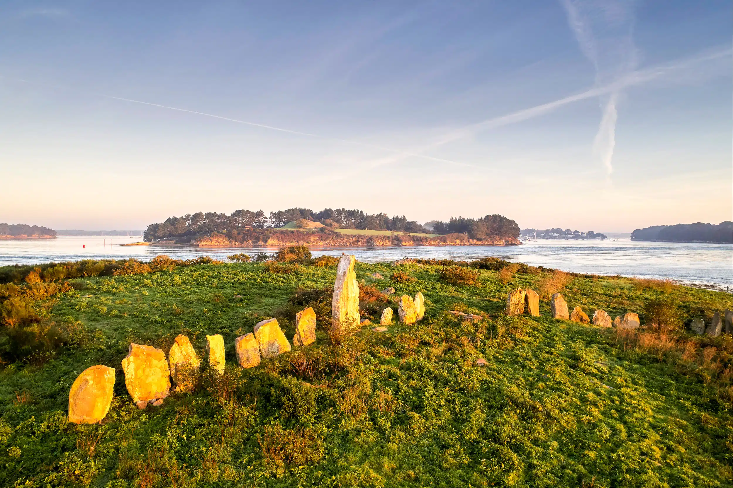 Er Lannic, les cromlechs engloutis Partager sur Facebook Partager sur Twitter Accueil » Explorer » Vivre l’exceptionnel… » Visites » Les mégalithes du Golfe du Morbihan » Er Lannic, les cromlechs engloutis Mégalithes Au nord d’Arzon, l’ilot d’Er Lannic abrite deux alignements de menhirs en forme de fer à cheval en partie immergés par la mer. Pour voir ces vestiges de plus près, embarquez pour le circuit Er Lannic couplé avec la visite du cairn de Gavrinis. Une double enceinte mégalithique insulaire Au sud de l’île de Gavrinis, l’ilot sauvage d’Er Lannic abrite de surprenants vestiges mégalithiques en partie immergés par la mer. Ces enceintes constituées de menhirs révèlent deux hémicycles en forme de fer à cheval. Comme pour Gavrinis, le site témoigne de la remontée des eaux depuis l’époque néolithique. Le cromlech nord disposé sur l’îlot présente une forme quadrangulaire de 50 m de diamètre qui s’ouvre au sud. Il est constitué de 65 menhirs allant de 1,20 m à 4,40 m de hauteur. Le cromlech sud de forme circulaire est en partie immergé par la mer. Il s’ouvre vers l’est sur 60 m de diamètre et est aligné sur le lever du soleil. Il compte une trentaine de menhirs d’une hauteur régulière de 4 mètres. D’autres pierres levées ont été retrouvées sur le site d’Er Lannic, qui abrite au total pas moins de 119 menhirs ! Les fouilles archéologiques ont permis de dater l’édification de ces hémicycles aux alentours de 3500 avant notre ère. Cromelec’h d’Er Lannick Cromelec’h d’Er Lannick Cromelec’h d’Er Lannick L’excursion touristique au large d’Er Lannic L’île d’Er Lannic demeure une propriété privée et une réserve ornithologique interdite d’accès au public. On peut toutefois la voir depuis l’île de Gavrinis qui lui fait face ou en l’approchant depuis la mer, mais sans pouvoir y accoster. Le site du Cairn de Gavrinis propose une visite jumelée avec Er Lannic sous forme de circuit commenté. La visite se fait au départ du port de Lamor-Baden et propose le contournement en bateau de la double enceinte mégalithique d’Er Lannic couplée à la visite du cairn. Comptez environ 2 h 30 pour l’excursion complète. Un site archéologique découvert au 19e siècle Le premier hémicycle du site mégalithique d’Er Lannic est découvert par G. de Closmadeuc en août 1866. Il découvre quelques années plus tard le second hémicycle fortuitement lors des grandes marées en 1872. En 1919, le relevé réalisé par R. Merlet offre une vision nouvelle de l’ensemble mégalithique avant la restauration du site par Z. Le Rouzic et Saint-Just Péquart de 1923 à 1926. En 1991 et 1992, une association de plongée sous-marine spécialisée dans le mégalithisme régional a effectué différents relevés topographiques des lieux. Les fouilles effectuées par Z. Le Rouzic ont révélé une grande quantité de fragments de céramique (coupes à pied creux) qui laissent alors supposer une fonction cultuelle du lieu. Des centaines de silex, polissoirs et haches polies ont aussi été mises au jour. Parmi les hypothèses émises, outre la fonction de sanctuaire et de centre religieux de ces deux hémicycles, il semblerait que le site puisse également avoir été occupé par un atelier de taille et de façonnage de haches polies. Infos pratiques Explorez les autres mégalithes du Golfe du Morbihan… Les mégalithes du Golfe du Morbihan Mégalithes Le cairn de Gavrinis Mégalithes Le cairn de Petit Mont Mégalithes Visiter l'île mégalithique de Gavrinis Gavrinis Mégalithes Mer Les mégalithes des Landes de Lanvaux Mégalithes