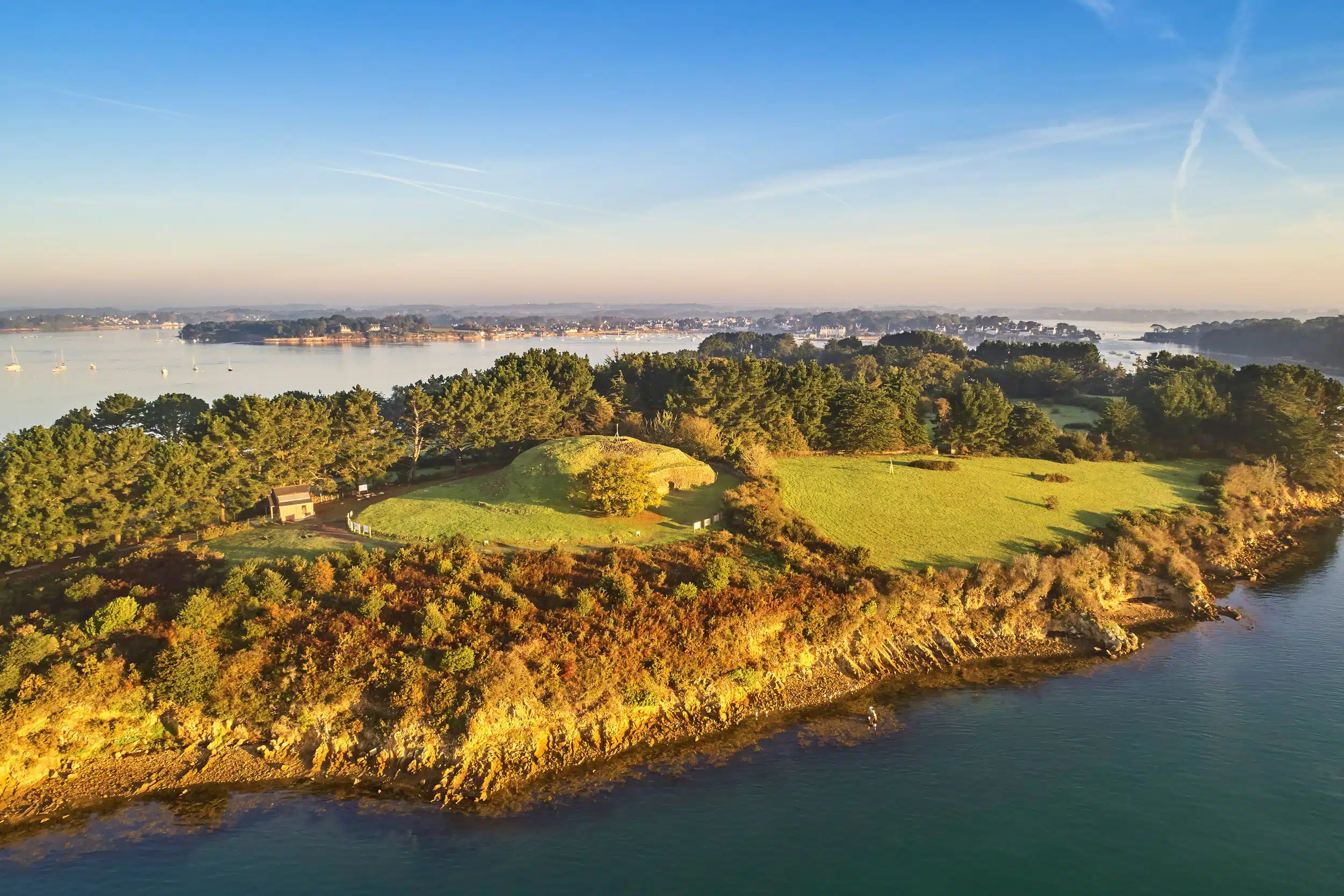 Le cairn de Gavrinis Partager sur Facebook Partager sur Twitter Accueil » Explorer » Vivre l’exceptionnel… » Visites » Les mégalithes du Golfe du Morbihan » Le cairn de Gavrinis Mégalithes Découvrez les somptueux décors gravés du monument mégalithique de l’île de Gavrinis. Ce site mystérieux accessible en bateau réserve un panorama grandiose sur les îles du golfe du Morbihan. Embarquez depuis le port de Lamor-Baden pour une visite guidée exceptionnelle d’un cairn insulaire. Un site mégalithique unique au monde À l’embouchure du golfe du Morbihan se trouve l’île de Gavrinis et son mystérieux cairn. Ce vestige funéraire du Néolithique édifié il y a plus de 6000 ans est célèbre pour sa profusion de décors gravés dont la signification demeure toujours une énigme pour les archéologues. Le cairn de Gavrinis construit en pierres sèches offre des dimensions titanesques. Cette butte de terre et de pierres qui s’étend sur 50 mètres de diamètre et 6 mètres de haut recouvre un dolmen. Celui-ci réserve un couloir de 14 mètres de long sur 1,50 mètre de large qui conduit à une chambre funéraire. Le dolmen compte une cinquantaine de dalles de pierre juxtaposées dont 29 dalles de pierres dressées composent le couloir. Les parois présentent de mystérieuses gravures datées de 3700 av. J.-C. Ces décors sculptés forment des courbes, des lignes droites, des cercles et des zigzags aux multiples combinaisons qui lui valent le surnom de « chapelle Sixtine du Néolithique ». Cairn de Gavrinis – Larmor-Baden Cairn de Gavrinis – Larmor-Baden Cairn de Gavrinis – Larmor-Baden Cairn de Gavrinis – Larmor-Baden Cairn de Gavrinis -Accès depuis le port de Larmor-Baden Cairn de Gavrinis – Larmor-Baden Les origines du cairn dE Gavrinis La découverte du cairn de Gavrinis date de 1832. Plusieurs campagnes de fouilles et de restauration ont été menées sur le site mégalithique du golfe du Morbihan entre 1835 et 1995. Initiées par Prosper Mérimée, les premières fouilles ont permis de dégager le dolmen intérieur et son couloir tandis que les premiers travaux de restauration ont commencé dans les années trente. Depuis l’acquisition en 1961 du monument historique par le Département du Morbihan, la mise en valeur du cairn de Gavrinis se poursuit. Le site demeure l’un des fleurons de la candidature à l’inscription au patrimoine mondial de l’humanité des sites mégalithiques du Morbihan prévue en 2024. Entre 2011 et 2013, les gravures du cairn de Gavrinis ont été entièrement numérisées. Cette représentation en 3D du site funéraire permet de mieux l’étudier et faciliter la création de visites virtuelles des endroits fermés au public. Visiter le cairn de Gavrinis Afin de préserver ce site exceptionnel, mais fragile, seules les visites guidées en petit groupe sont possibles pour visiter le cairn. L’embarquement pour l’île de Gavrinis a lieu principalement au port de Lamor-Baden, mais d’autres points de départ sont possibles selon la saison. La traversée est accompagnée d’un guide. Elle s’effectue en vedette et dure une quinzaine de minutes. On profite de cette mini-croisière commentée pour observer le paysage maritime exceptionnel qui entoure le site et comprendre son évolution depuis l’époque néolithique. Une fois arrivés sur l’île de Gavrinis et au cairn, comptez 90 minutes de visite sur le site. Si vous venez à Gavrinis en famille, pensez à télécharger l’application Baludik avant d’embarquer. Elle permet de suivre un parcours ludique sous forme de jeux et d’énigmes qui amuseront petits et grands. Infos pratiques Explorez les autres mégalithes du Golfe du Morbihan… Les mégalithes du Golfe du Morbihan Mégalithes Visiter l'île mégalithique de Gavrinis Gavrinis Mégalithes Mer Le cairn de Petit Mont Mégalithes Er Lannic, les cromlechs engloutis Mégalithes