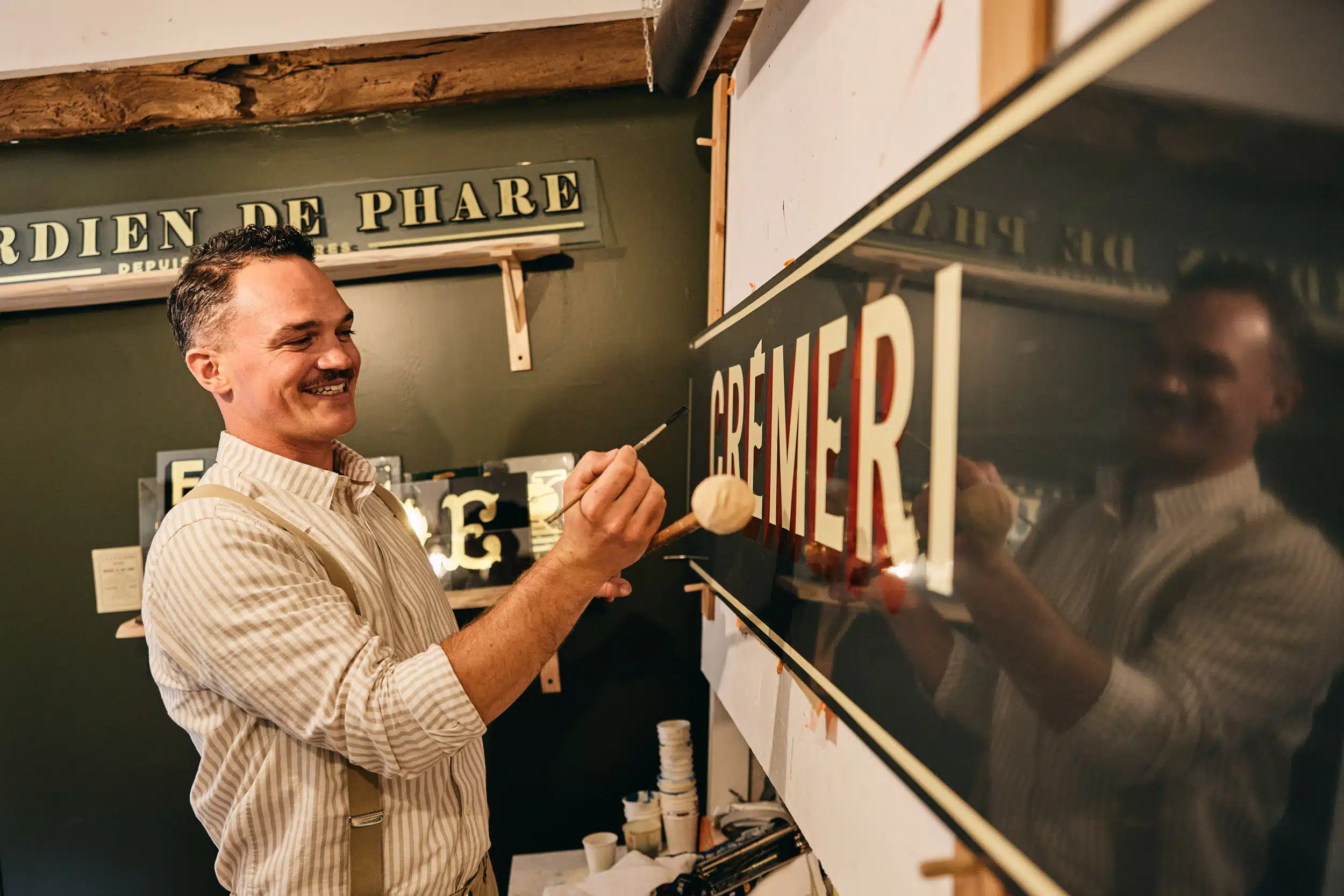 Artisans, ils perpétuent les savoir-faire Dans le Golfe du Morbihan, des passionnés et fervents défenseurs de l’artisanat, continuent de faire vivre des métiers parfois ancestraux, mais pas si oubliés ! Partager sur Facebook Partager sur Twitter Accueil » Explorer » Rencontrer l’exceptionnel… » Rencontres de passionnés » Artisans, ils perpétuent les savoir-faire Mer On peut les voir, à l’œuvre, un pinceau en main, aiguisant finement la lame d’un couteau ou gravant une estampe sur une presse typographique. Peintre en lettres, affûteur-rémouleur, cordonnier, graveurs-imprimeurs… Dans le Golfe du Morbihan, des passionnés et fervents défenseurs de l’artisanat, continuent de faire vivre des métiers parfois ancestraux, mais pas si oubliés ! Tristan Gesret Il porte la moustache, de fines bretelles et travaille en musique des années 30. « J’aimecréer l’ambiance », assume Tristan Gesret. « C’est aussi une façon de faire parler de lapeinture en lettres, de promouvoir ce savoir-faire qui a quasiment disparu … », et pourlequel ce trentenaire a eu, lui, un vrai coup de coeur. Ses belles lettres se lisent sur unedizaine d’enseignes à Vannes, la signalétique municipale de Baden, un pignon de maisonà Grand-Champ, entre autres. Des pleins, des déliés, des fûts (le trait vertical d’une lettre),des ombres … réalisés à l’aide d’une canne sur laquelle est calée la main qui tient le pinceau.« Je n’invente rien, je retranscris des techniques que j’ai apprises. Un fût doit être plus épais que le trait horizontal, sinon, visuellement, ça ne marche pas, un E semblera écrasé par exemple. Un plein à la place d’un délié, ça ne fonctionne pas non plus … » Souvent soumis au respect d’une charte graphique, Tristan se voit parfois laisser carte blanche. Comme pour le chantier de la Buvette de l’étang de Brandivy, sur lequel l’a rejoint Guy, peintre en lettres retraité. « Même après 10 ans sans pratiquer, son geste était impeccable ! », confie Tristan, encore impressionné. https://www.tristangesret.fr/ Celt’Affûtages Redonner le sourire Affuteur-rémouleur itinérant, Michel Le Gallic n’a pas le sentiment d’exercer un métier oublié. « Ce qui s’est perdu, c’est d’aller à la rencontre des clients ».Avec son camion-atelier, Michel change tous les jours d’endroit : le mardi à Vannes, le jeudi à Sarzeau, le vendredi à Arradon … Après une vie active bien remplie, il est en recherche de reconversion lorsqu’il tombe sur la vieille meule de son père, boucher. « C’est lui qui m’a appris à aimer les couteaux, à les entretenir ». Aujourd’hui, Michel aiguise couteaux,ciseaux, lames de robot de cuisine, sécateurs, chaînes de tronçonneuse … « et souvent des outils avec un fort lien affectif, parce qu’ils ont appartenu au père ou au grand-père », observe-t-il. « Leur redonner vie et voir mes clients repartir avec le sourire, c’est là monvrai plaisir ! » facebook.com/celtaffutages/ Former la relève Un « répar’acteur », c’est ainsi que se définit Bertrand Pasquier, cordonnier depuis 42 ans, dont 10 à Sarzeau à la tête de la cordonnerie Sibemo. « On peut tout réparer ou presque ! », assure-t-il. Talons de bottes ou sneakers …« Le métier a su évoluer et s’adapter aux nouveaux modes de consommation de nos clients. Aujourd’hui, nous réparons plus de sneakers que de mocassins en cuir ». Depuis 5 ans, Bertrand enseigne ses méthodes à Julien, son ancien apprenti devenu salarié de lacordonnerie. Avec l’espoir de le voir assurer la relève. « Si on ne forme pas les jeunes, il n’y aura personne pour reprendre nos boutiques ». Les imagiers La transmission est aussi dans l’ADN du collectif Les Imagiers, qui anime régulièrement des ateliers d’initiation à la gravure. « Nous sommes des fabricants d’objets imprimés,volontaires pour défendre un système d’impression artisanal », se présentent Jean-Baptiste Cautain et Jean-Marie Flageul. Ces deux « Imagiers » dessinent, gravent et impriment surpresse typographique des estampes et affiches en petite quantité. Ils utilisent des caractères mobiles anciens, en bois ou en plomb, et fabriquent leur propre encre pour les images. Si tous les deux travaillent d’après ce qu’ils voient, chacun a son style. Assez réaliste pourJean-Baptiste, plus minimaliste pour Jean-Marie. Cairn de Gavrinis, Petit Mont, Landes de Lanvaux, rues de Vannes… le Golfe reste pour eux une vraie source d’inspiration. lesimagiers.fr UNE AFFAIRE DE FAMILLE « La crêperie, c’est toute notre enfance », lance Delphine Laigo. Avec ses frères, elle a été élevée au milieu des billigs. C’est leur grand-mère, Eugénie, qui, en 1962, a ouvert une crêperie près de l’église de Brandivy, reprise par leurs parents Jean-François et Renée en 1980. Delphine, David et Damien s’y sont associés en 2008. Initialement installée dans la maison d’Eugénie, la Crêperie du Puits s’est largement étendue aux bâtiments voisins et compte aujourd’hui 5 salles. La recette de la pâte, elle, reste un vrai secret de famille. D’ailleurs, elle n’est même pas écrite et se transmet dans le creux de l’oreille de génération en génération… METTRE L’OUTIL EN MAIN Des enfants, de 9-14 ans, initiés aux métiers manuels par des artisans retraités bénévoles, avec de vrais outils, dans de vrais ateliers : c’est le principe de l’association L’Outil en Main, qui a des antennes à Grand-Champ et à Sarzeau. Electricité, couture, tapisserie-décoration, maçonnerie, bijouterie, plomberie… autant de découvertes de savoir-faire qui peuvent aussi susciter des vocations. sarzeau.fr/outil-en-main / loutilenmainduloch.fr/ Découvrez les autres portraits de passionnés… Portrait des « Amis du sinagot » Portrait de Fabrice Toledo Aux filles des marées
