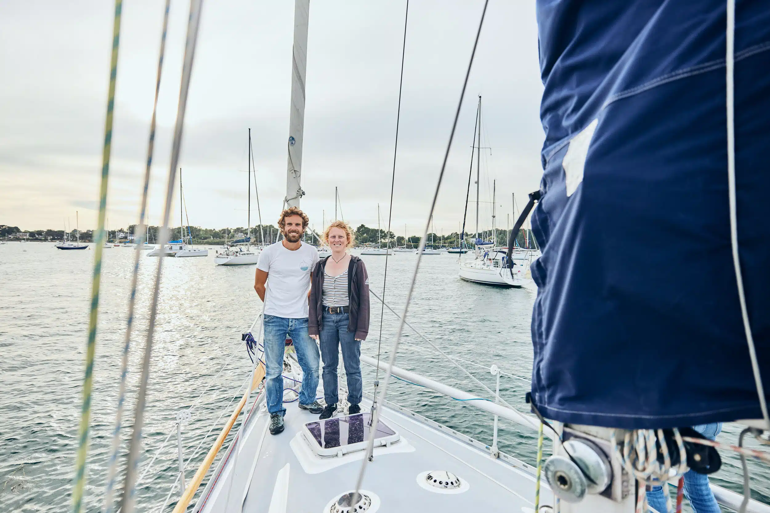 Portraits de Charly et Guénola À bord d’Avrik, un voilier avec la capacité d’affronter les mers de l’Atlantique Nord, le trio suivra pendant 18 mois la route des migrations des baleines à bosse et ira à la rencontre d’hommes et de femmes engagés dans la protection des cétacés et de l’environnement. Partager sur Facebook Partager sur Twitter Accueil » Explorer » Rencontrer l’exceptionnel… » Rencontres de passionnés » Portraits de Charly et Guénola Mer Voguer sur la route des migrations des baleines C’était en 2018. Charly, Clémence et Guénola se rendent au salon du bateau d’occasion « Le Mille Sabords Port du Crouesty – Golfe du Morbihan » à Arzon. Ils y dénichent Arvik, un voilier avec la capacité d’affronter les mers de l’Atlantique Nord. À son bord, le trio suivra pendant 18 mois la route des migrations des baleines à bosse et ira à la rencontre d’hommes et de femmes engagés dans la protection des cétacés et de l’environnement. Un documentaire retrace la folle épopée d’Arvik et la volonté de l’équipage d’encourager le public à passer à l’action : « Save ocean, Use less plastic » ! Avec toutes les spécificités maritimes du golfe, quand tu navigues dans ces eaux là, tu es prêt à naviguer à peu près dans toutes les eaux du monde. Les eaux calmes du Golfe bercent doucement Tobago, le nouveau bateau de Charly et Guénola. À son bord, le couple prépare déjà une nouvelle expédition. À peine rentrés de leur grande boucle Atlantique, Charly et Guénola n’envisagent plus de retrouver leur vie d’avant. Avant, Charly était ingénieur du son. Guénola, technicienne lumière dans le spectacle vivant. Mais ça c’était avant… Avant de suivre la route des migrations des baleines qui, pendant 18 mois les a amenés, avec leur co-équipière Clémence, de l’Écosse aux Canaries, des Antilles aux Açores et des Açores en Islande ! « Voir le monde de ses yeux est mille fois mieux que n’importe quel rêve. »* Pour Charly et Guénola, le rêve rejoint l’évidence. « Pour autant, on ne voulait pas partir juste pour le plaisir. On voulait que notre voyage soit utile », explique Charly. Leur périple est donc parcouru en mode zéro-déchet, de la préparation du bateau au mode de vie à bord. Du vrac, pas de frigo et… du moteur avec une extrême parcimonie… Ce qui leur offre leurs plus beaux moments avec les baleines. « Notre approche était d’observer les baleines de manière non invasive, raconte Charly. Par exemple, lors de notre traversée de l’Atlantique, on n’a pas eu de vent pendant deux jours. Et comme on est sur une approche écoresponsable, on n’a pas allumé le moteur. On a attendu que le vent revienne. On a même quasiment reculé de 16 km pendant ces deux jours-là. Le bateau dérivait et on s’est retrouvé proche d’une famille de cachalots qui était à la surface en train de « chiller » en quelque sorte. Le bateau s’est rapproché malgré nous et on a pu les observer et les enregistrer avec notre hydrophone. C’était un des moments inattendus et magiques de notre voyage. » Découvrez les autres portraits de passionnés… Portrait des « Amis du sinagot » Portrait de Fabrice Toledo Aux filles des marées