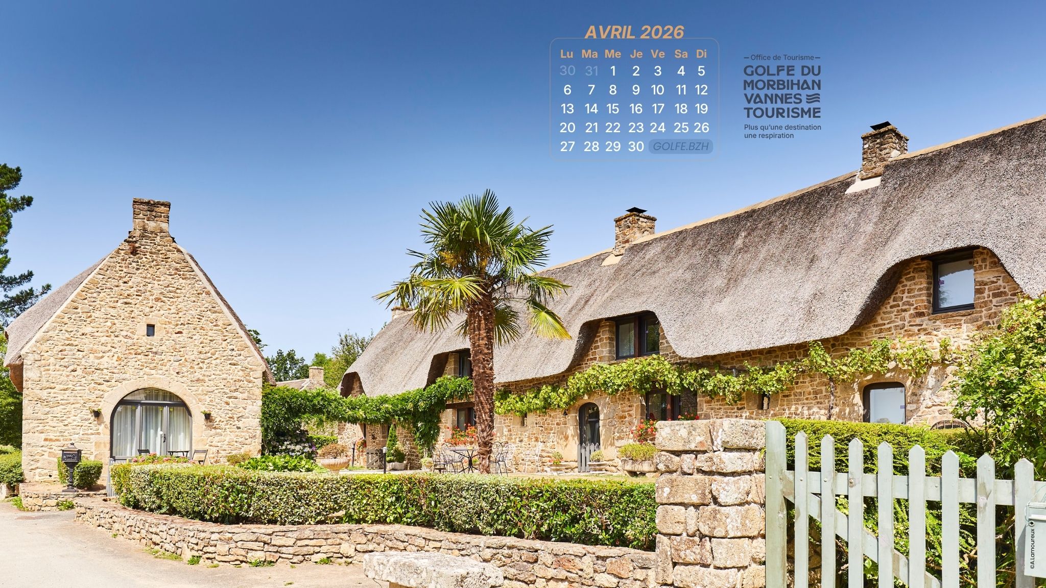Fonds d’écran Tous les mois, directement dans votre boîte mail recevez le fond d’écran du Golfe du Morbihan ! Partager sur Facebook Partager sur Twitter Accueil » Préparer » Infos pratiques » Fonds d’écran Personnalisez votre fond d’écran de PC, smartphone… à l’image du Golfe du Morbihan ! Voici le fond d’écran d’avril 2026 🌷 Avril, ça fleurit de partout ! Avec le changement d’heure, les journées s’allongent… et les idées de sorties aussi. Dans le Golfe du Morbihan, les événements éclosent un peu partout : concerts, animations, rendez-vous gourmands ou festifs… difficile de ne pas trouver une bonne raison de sortir. Un agenda qui se remplit, des soirées qui s’étirent, et cette petite impression que tout repart. 🔪🦪 Inédit : le premier couteau à huîtres monnaie de Paris 🎺 L’agenda des animations du mois d’avril Photo : ©A.Lamoureux – Hameau de Cahir – Plougoumelen JE Télécharge LA version HD Chaque mois, directement dans votre boîte mail ! Recevez une mise à jour mensuelle et gratuite de votre calendrier du Golfe du Morbihan, directement dans votre boîte mail. En soumettant votre adresse e-mail dans ce formulaire, vous êtes automatiquement inscrit à la GolfeLetter (la lettre d’info du Golfe du Morbihan). Vous pouvez vous désinscrire à tout moment via le lien qu’elle contient. Poursuivez votre visite Webcams Les marées dans le Golfe du Morbihan Panoramas 360°