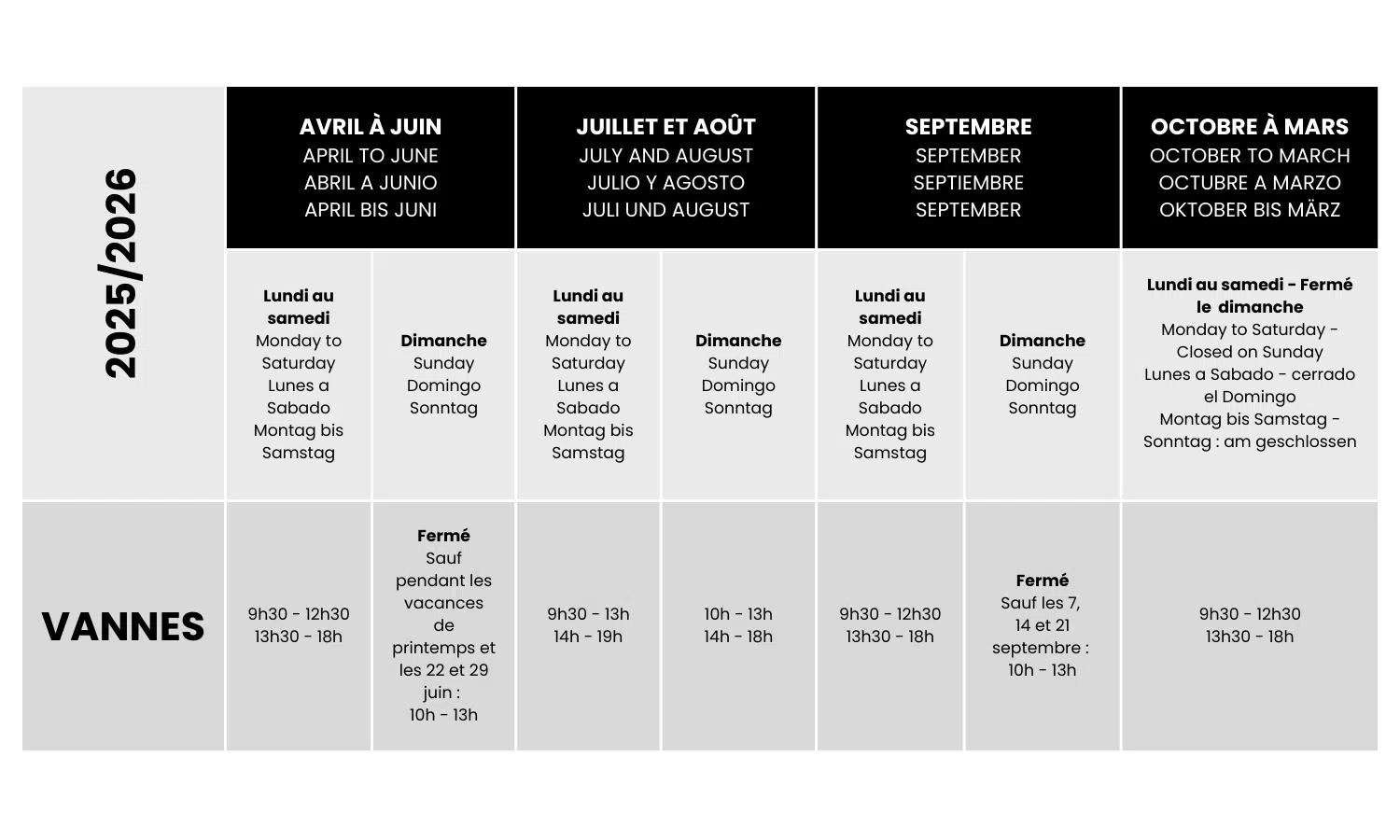 BIT de Vannes Partager sur Facebook Partager sur Twitter Accueil » Préparer » Infos pratiques » Office de Tourisme » BIT de Vannes Les horaires d’ouverture du bureau de Vannes HORAIRES D’OUVERTURE EXCEPTIONNELS Bureau fermé les 25 décembre et 1er janvier. Le bureau sera exceptionnellement fermé jeudi 11 décembre, de 9h30 à 12h30. Le bureau sera exceptionnellement fermé jeudi 18 décembre, de 14h à 18h. Le bureau fermera à 12h30 le 24 décembre. Le bureau fermera à 16h le 31 décembre. Poursuivez votre visite Votre week-end à Vannes Vannes La collection d'éditions 2025 Contact